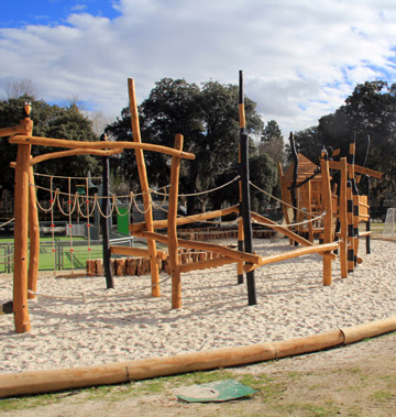 En la zona -para niños/as de 6 a 12 años- se ha colocado una estructura única con una Torre de Juego en uno de sus extremos (con un tobogán) que invita al niño/a a recorrerla en su totalidad retándole/a a escalar, agarrarse, a mantener el equilibrio y a deslizarse. En uno de sus laterales, dos caballos artesanales tallados en madera, -complementarios a esta estructura y en sintonía con la oferta de equitación del CCVM- ofrecen al niño/a un lugar donde descansar y columpiarse: estos dos animales soportan una hamaca central.